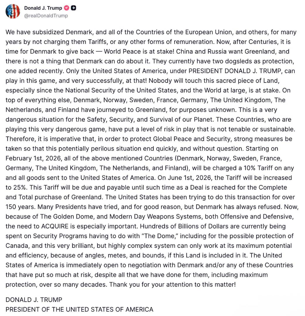 Trump declared in a Truth Social post that the tariffs would rise to **25%** on June 1 unless a deal is reached for the “Complete and Total purchase of Greenland.”
